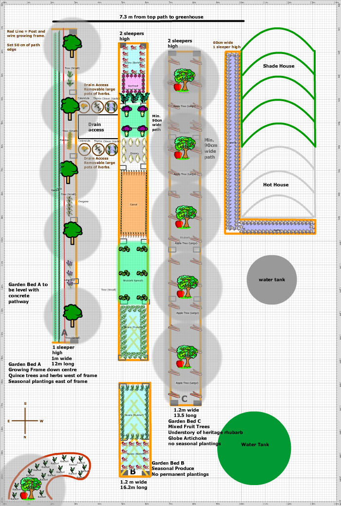Draft plan outlines creating raised garden beds made out of sleepers and steel uprights.